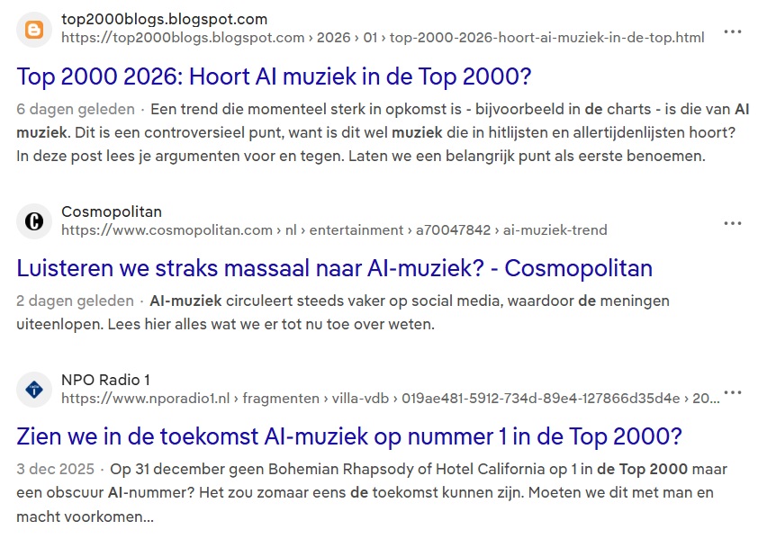 Het is leuk om als kleine schrijver zowel de grote merken als AI te kunnen verslaan. Dat komt namelijk steeds minder vaak voor. Wanneer je dan over AI en een groot merk schrijft, is het extra leuk wanneer dit lukt. Het lukte met een blogpost over AI-muziek in de Top 2000.
